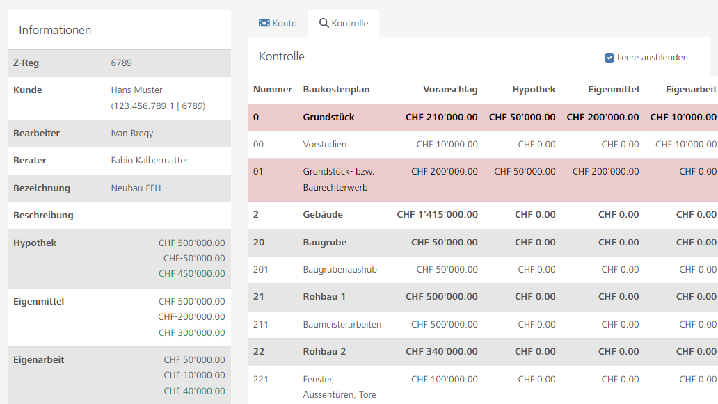 - Erfassung des Bauprojektes inkl. Eigenmittel, Eigenarbeit und Hypothek.