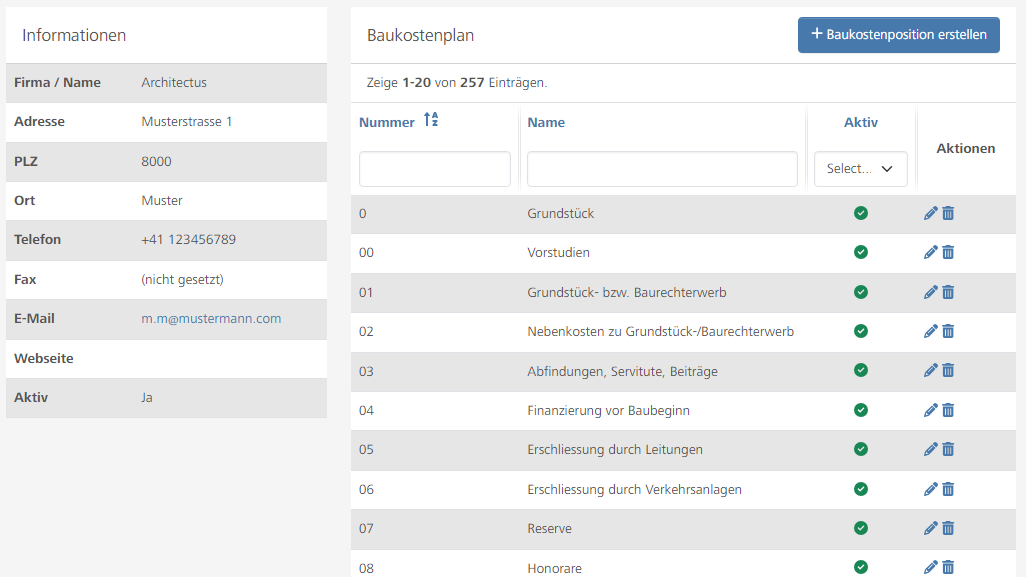 - Die Architekten werden dem Bauprojekt zugewiesen und der Baukostenplan übernommen. Eine schnelle Erfassung des Kostenvoranschlags ist so sichergestellt.